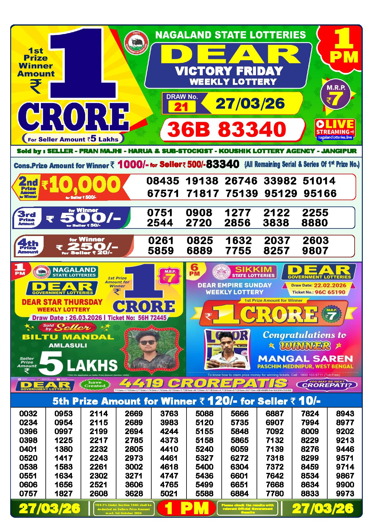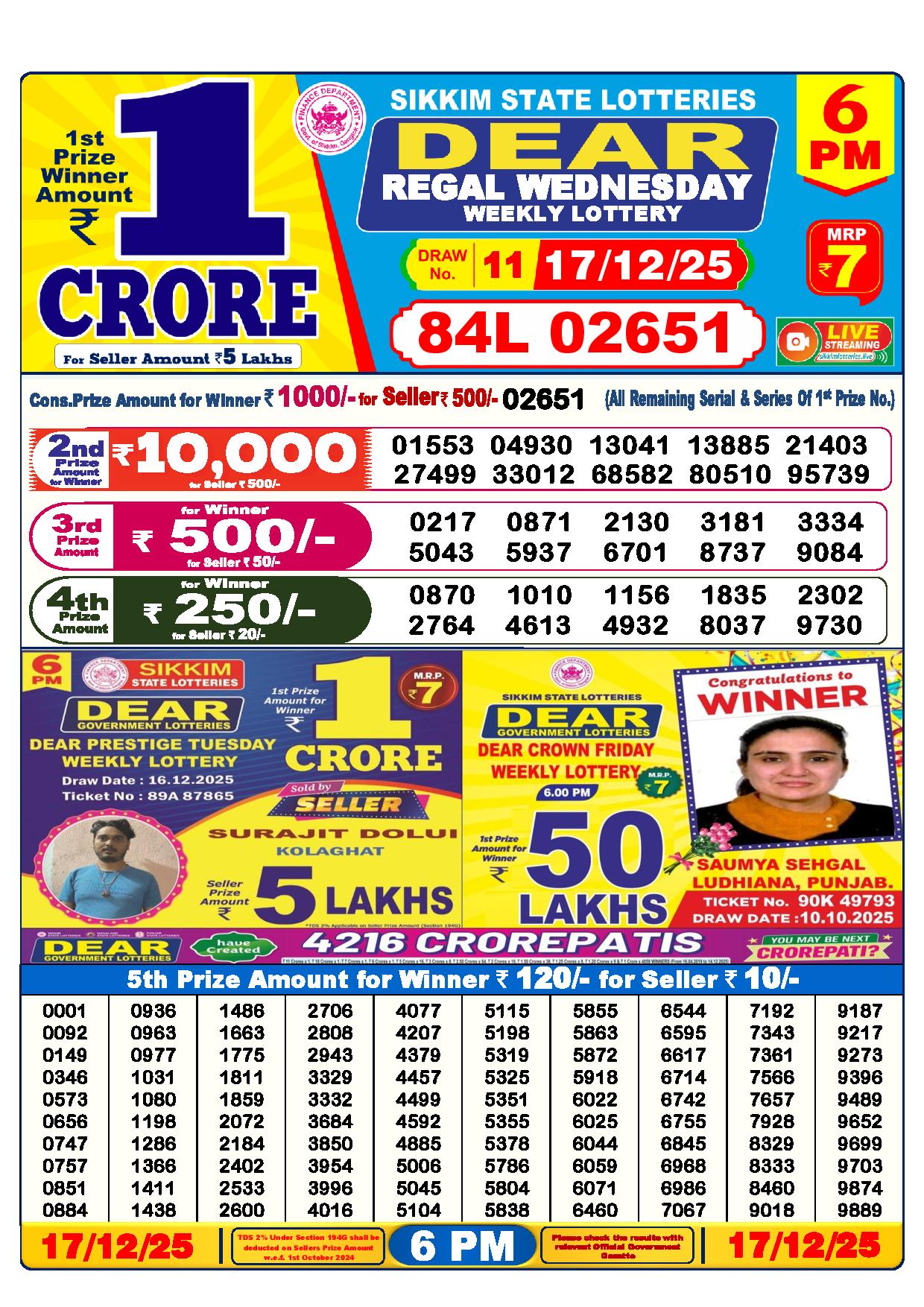 A vital source of funding for the State Government; the Nagaland State Lotteries were founded in 1972 under the direction of the Finance Department. Every day, there are three separate lotteries held: in the morning, during the day, and at night. Numerous lotteries operate under different names every day, giving away different sums of prizes. The highest reward, which includes a Super reward, is ₹1 crore. For just ₹6 a ticket, you can enter the daily Dear Morning, Dear Day, and Dear Evening.
