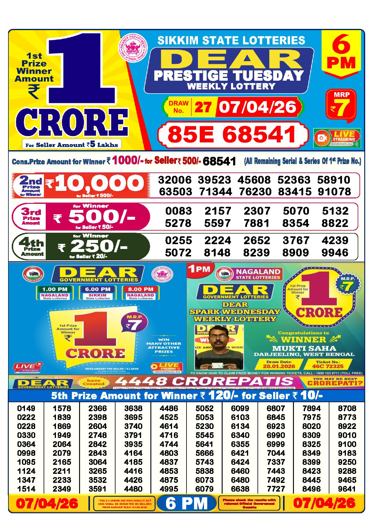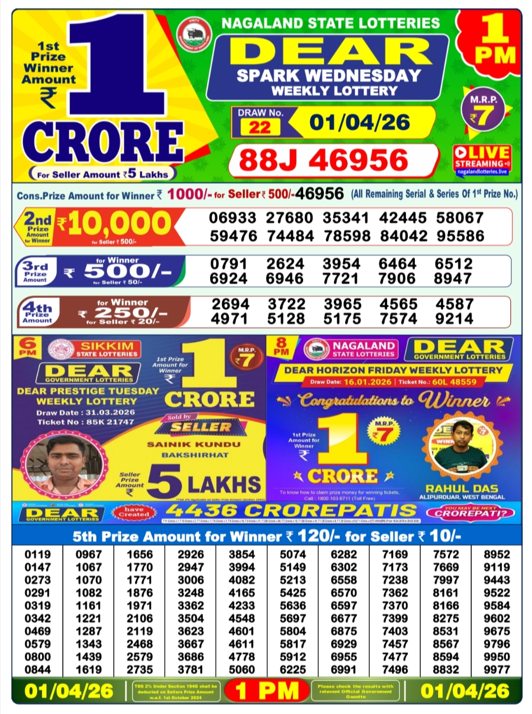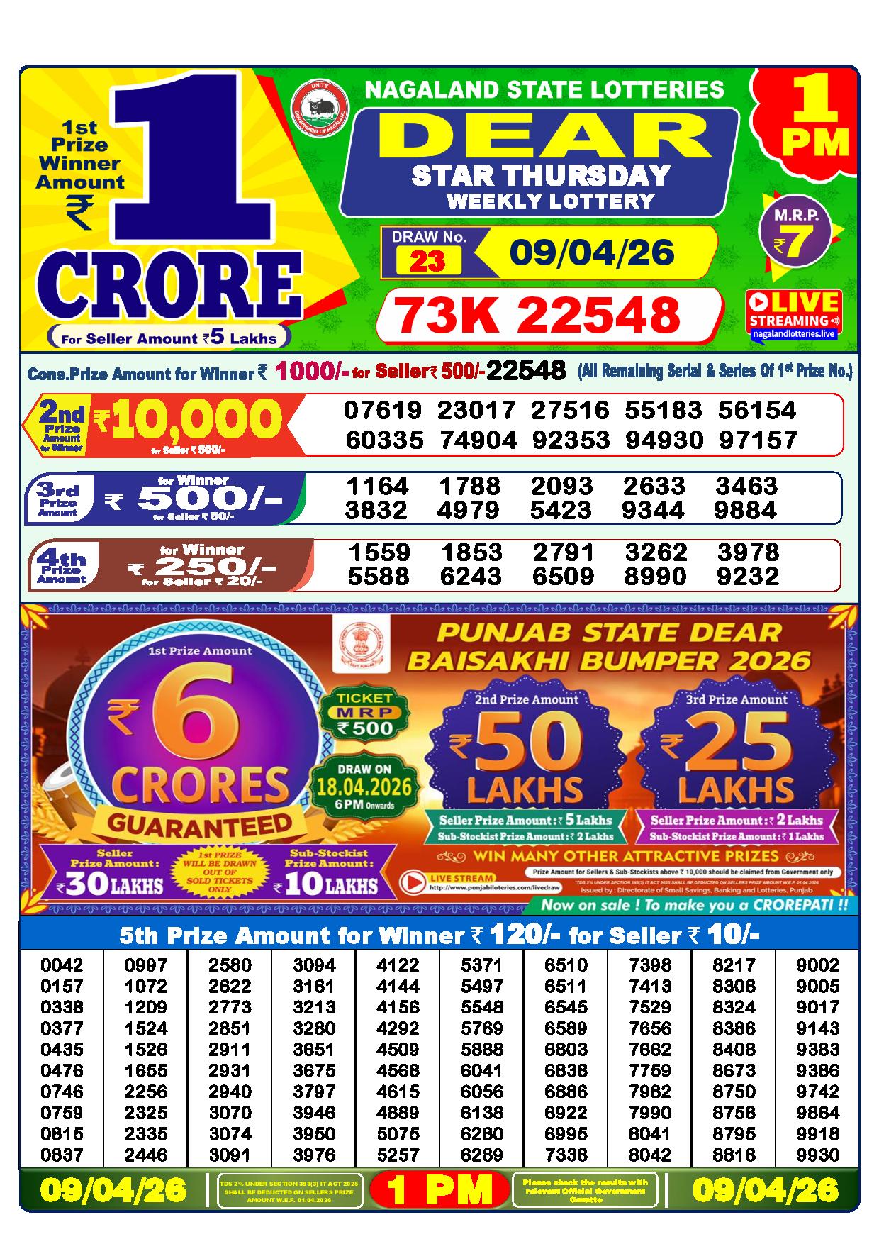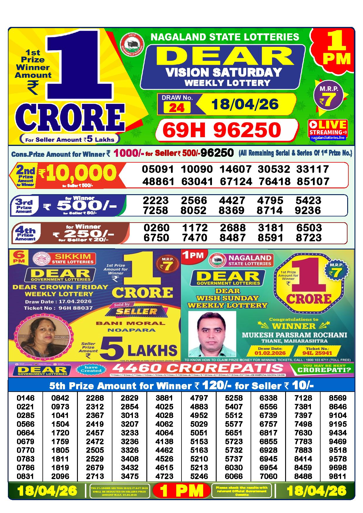 There are thrilling prizes up for grabs in this lottery dhankesari live at 1 pm. A whopping one crore rupees is the first prize. The second prize is at 9000 Rupees, the third prize is worth 450 Rupees, the fourth prize is worth 250 Rupees, and the fifth prize is worth 120 Rupees.