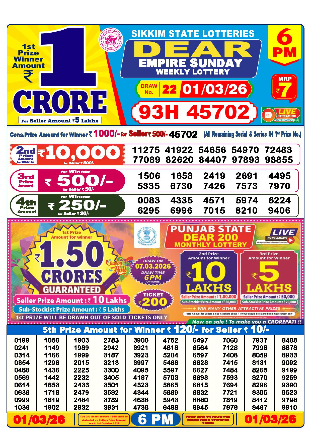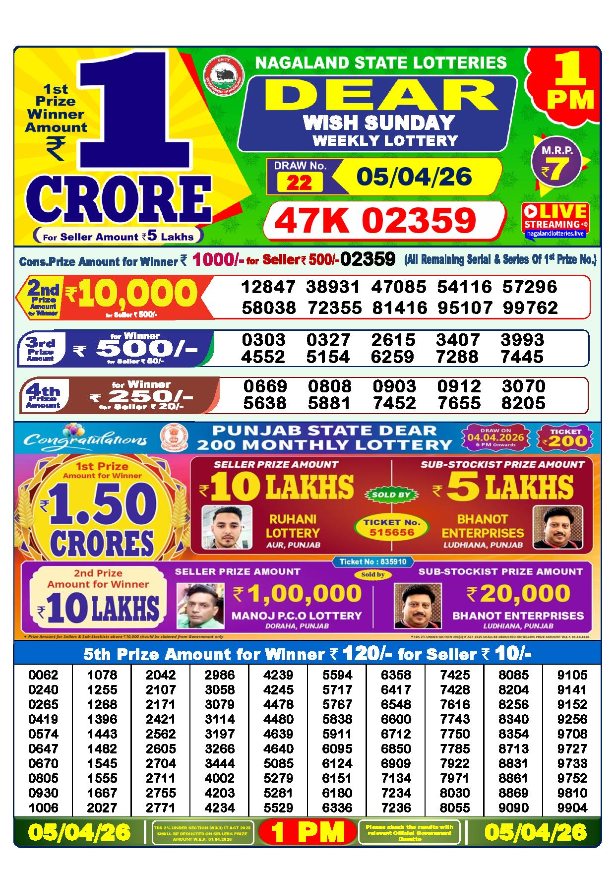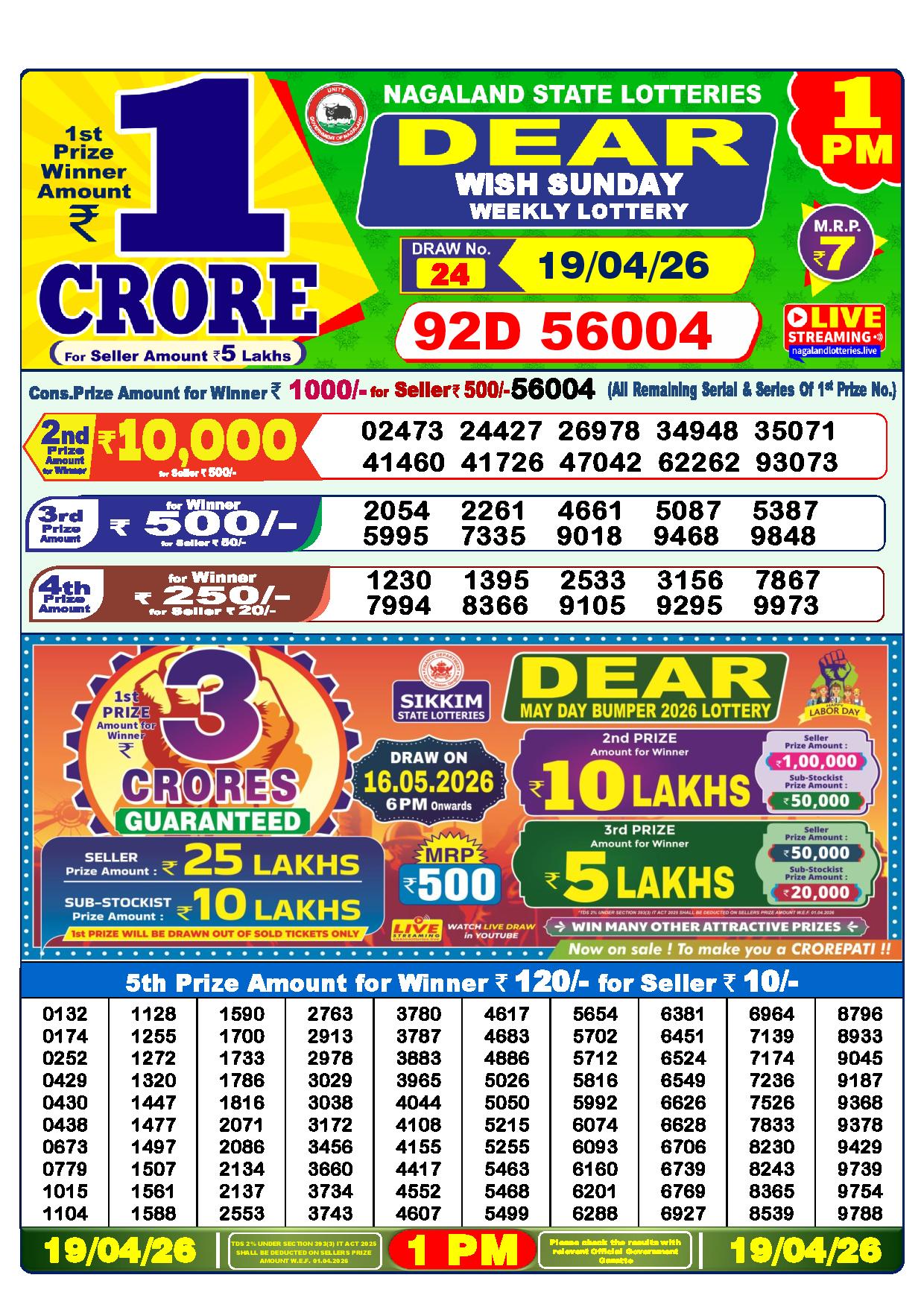 There are thrilling prizes up for grabs in this lottery dhankesari live at 1 pm. A whopping one crore rupees is the first prize. The second prize is at 9000 Rupees, the third prize is worth 450 Rupees, the fourth prize is worth 250 Rupees, and the fifth prize is worth 120 Rupees.