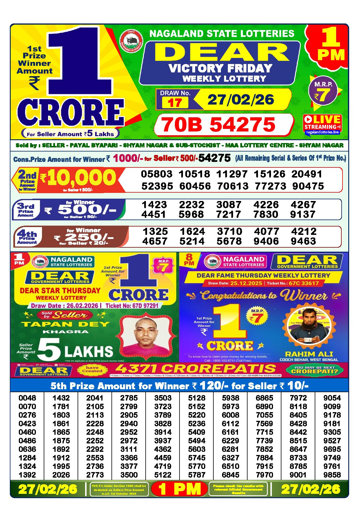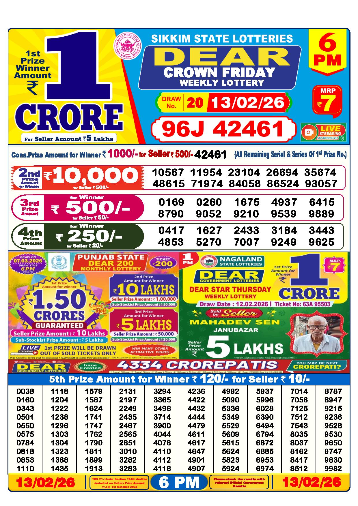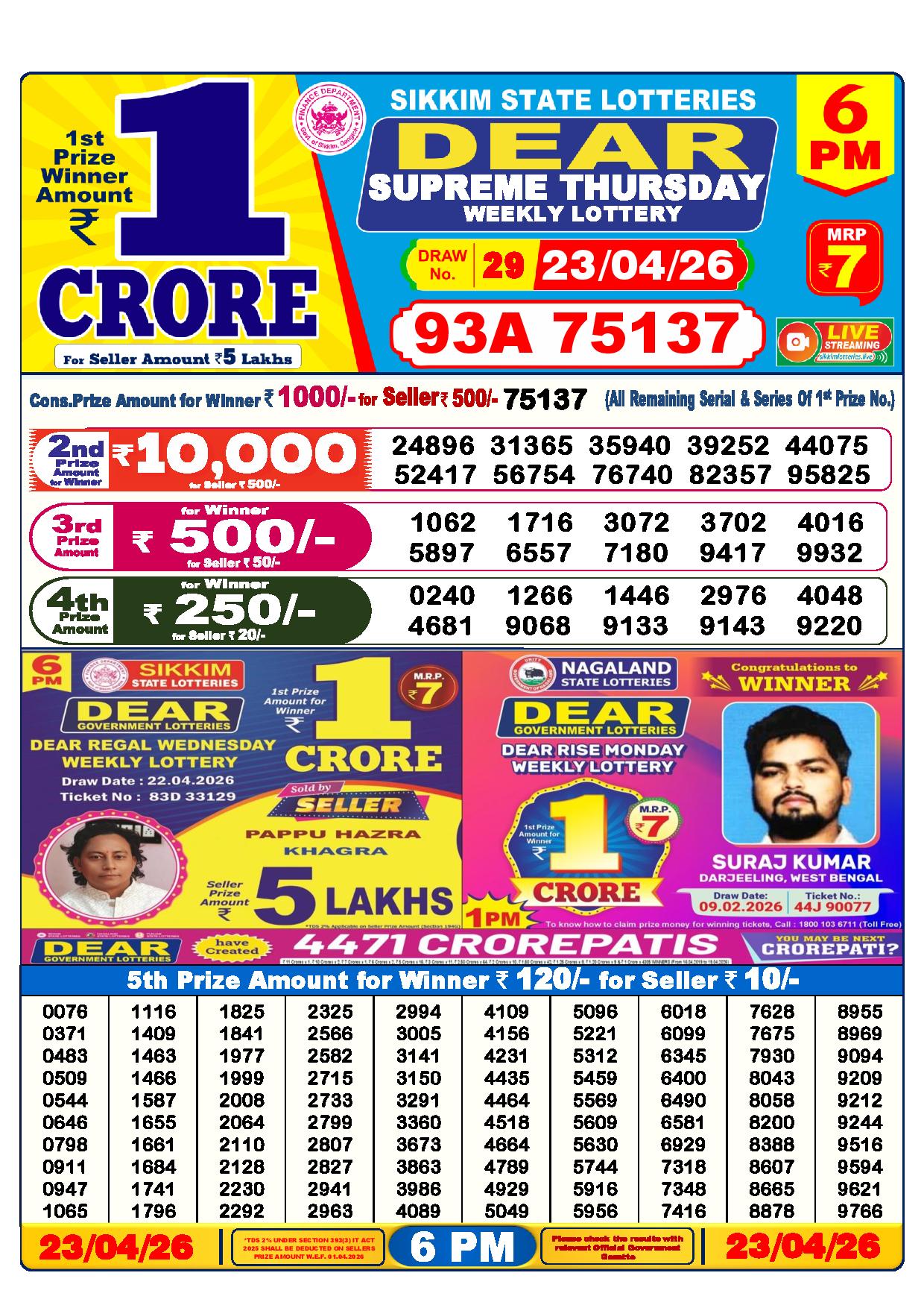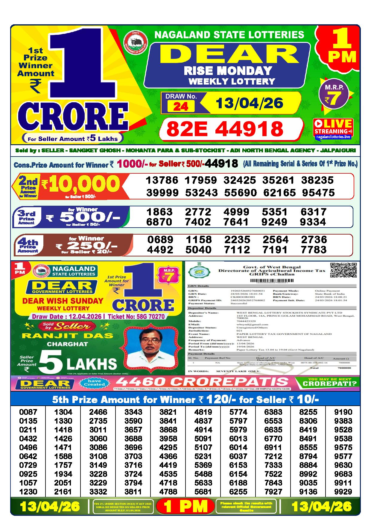 There are thrilling prizes up for grabs in this lottery dhankesari live at 1 pm. A whopping one crore rupees is the first prize. The second prize is at 9000 Rupees, the third prize is worth 450 Rupees, the fourth prize is worth 250 Rupees, and the fifth prize is worth 120 Rupees.