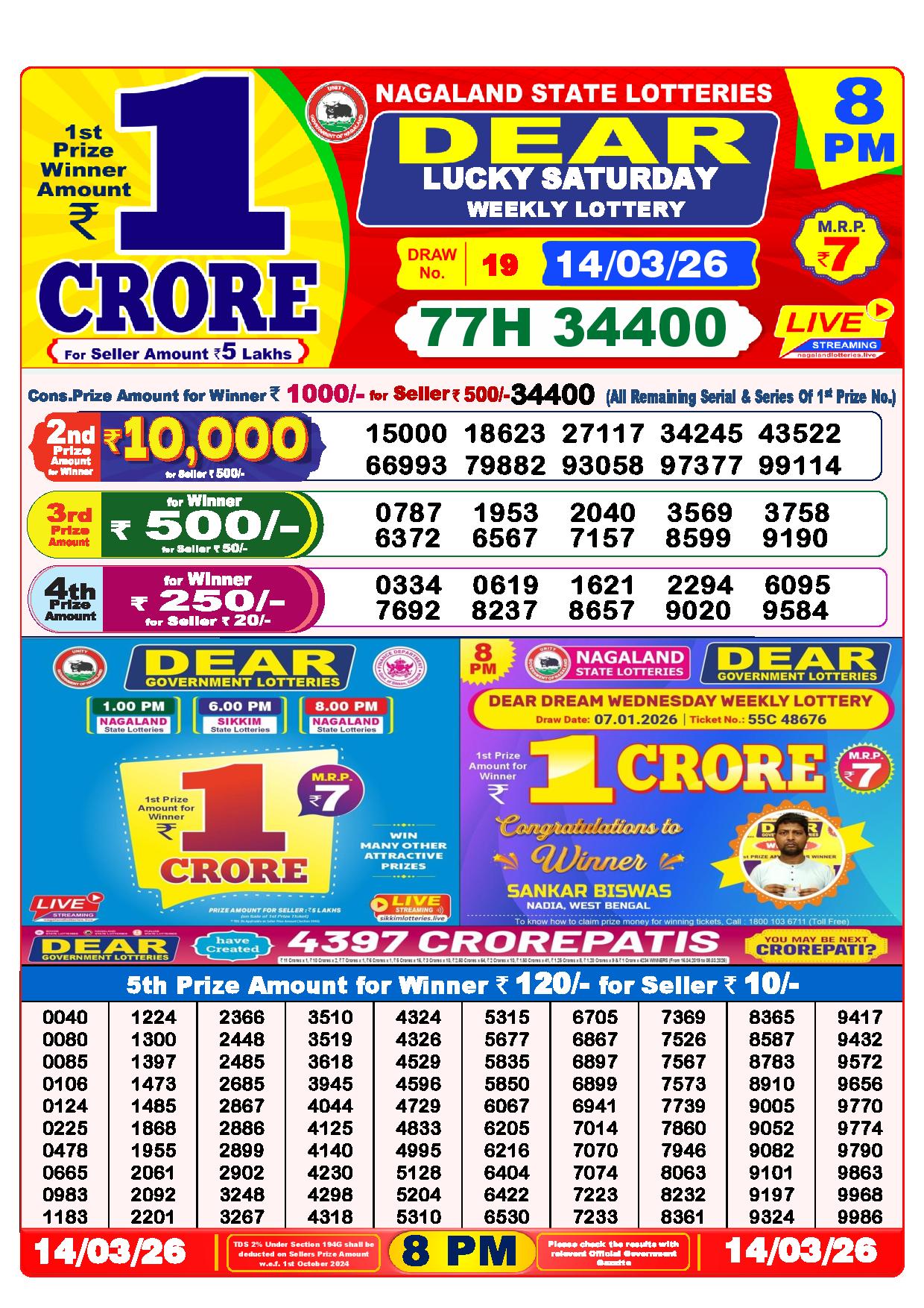 The Dhankesari lottery is awarding reward money to five lucky winners. The first prize is 1 crore rupees, the second prize is 9000 rupees, the third prize is 450 rupees, the fourth prize is 250 rupees, and the fifth prize is 120 rupees. Today’s lottery result will be announced at 8 PM. The Nagaland State Lottery released today’s 8PM draw, and the results are presented below.