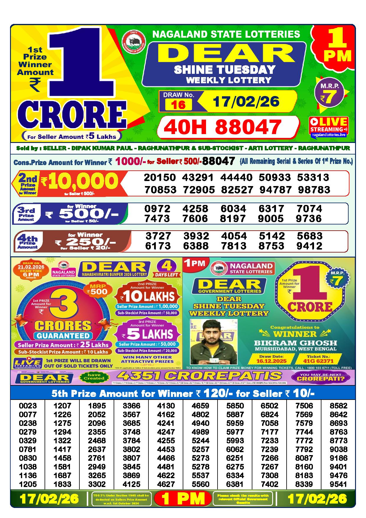 There are five prizes available in the 1 PM draw: a 1 crore rupee first prize, 9000 rupees second prize, 450 rupees third prize, 250 rupees fourth prize, and 120 rupees fifth reward. They are giving prizes to the lucky five winners. Below are the results of Nagaland’s 1 PM draw for today.