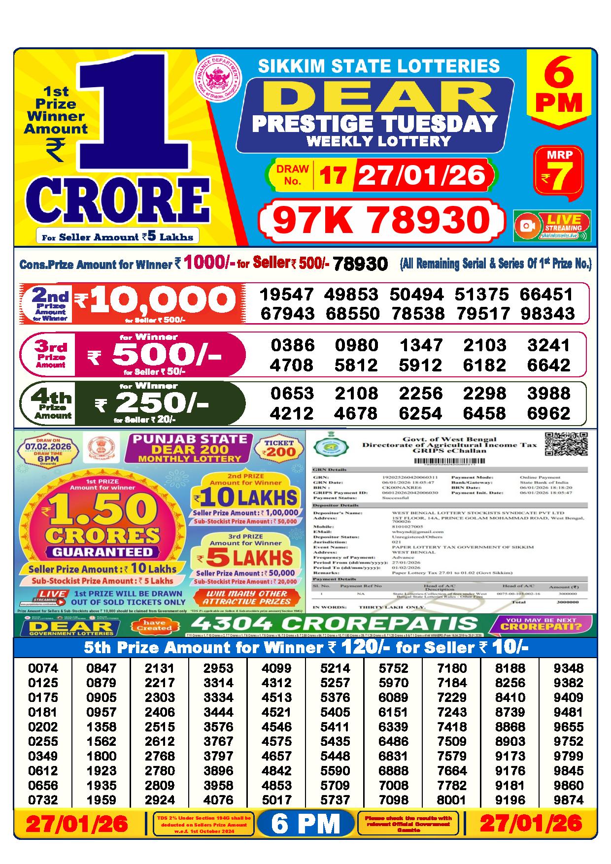 There are five prizes available in the 1 PM draw: a 1 crore rupee first prize, 9000 rupees second prize, 450 rupees third prize, 250 rupees fourth prize, and 120 rupees fifth reward. They are giving prizes to the lucky five winners. Below are the results of Nagaland’s yesterday draw for today.