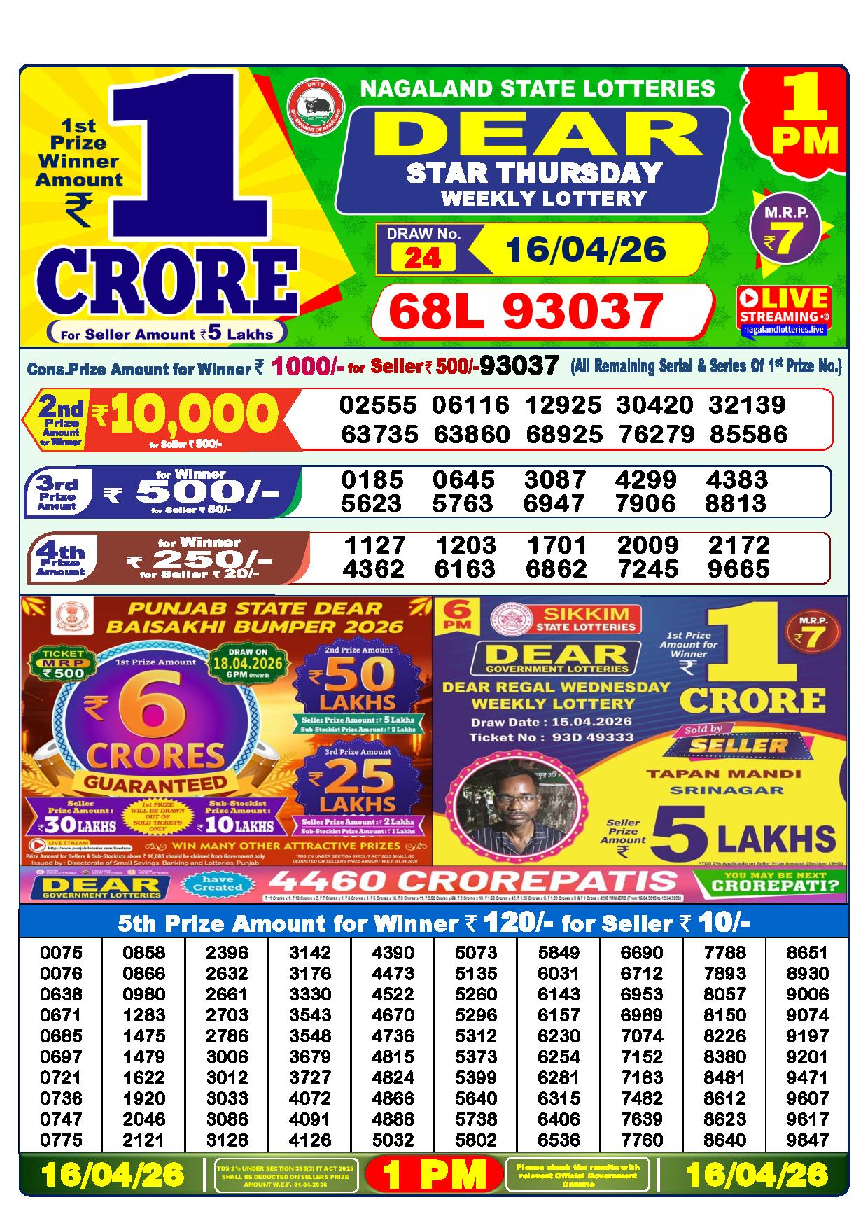 There are thrilling prizes up for grabs in this lottery dhankesari live at 1 pm. A whopping one crore rupees is the first prize. The second prize is at 9000 Rupees, the third prize is worth 450 Rupees, the fourth prize is worth 250 Rupees, and the fifth prize is worth 120 Rupees.